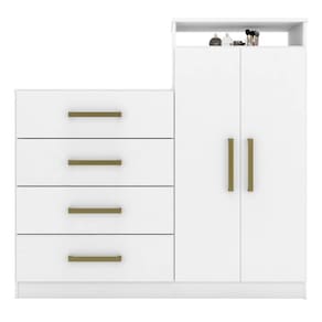 Uma cômoda elegante que complementa o ambiente e oferece muita praticidade. Com quatro gavetas espaçosas e um armário de duas portas com duas prateleiras internas, espaço para acomodação de roupas e objetos não será um problema. Ainda conta com um nicho na parte superior para itens menores ou objetos de decoração. Com puxadores na cor bronze, sua fabricação é feita em MDP de alto padrão, com acabamento resistente, proporcionado por sua pintura UV . Acabamento da Gaveta: Pintura UV Acabamento da Porta: Pintura UV Acabamento da Prateleira: Pintura UV Ambiente Principal: Quarto Complexidade da Montagem: Alta: deve ser montado por um montador especializado Cor: Branco Cor do Produto: Branco Cor Interna: Branco Escala de Brilho: Brilhante Escala de Brilho da Gaveta: Brilhante Escala de Brilho da Porta: Brilhante Escala de Brilho da Prateleira: Brilhante Gaveta com Chave: Não Itens Inclusos: 1 Cômoda, Kit Ferragens e Manual de Montagem Manual de Montagem e Instalação: https://cdn2.madeiramadeira.com.br/atributo/demobile-novo/1195022-4270-comoda-02-portas-04-gav-aurea.pdf Material da Gaveta: MDP Material da Porta: MDP Material da Prateleira: MDP Material do Fundo: HDF Material do Puxador da Gaveta: Plástico Material do Puxador da Porta: Plástico Material Principal: MDP Necessita Montagem: Sim Origem do Produto: Nacional Peso: 42.3 Peso Máximo por Gaveta: 3 kg Peso Máximo por Prateleira: 5 kg Possui Espelho: Não Possui Nichos: Não Possui Pés: Não Possui Portas: 02 Possui Prateleiras: 03 Recomendações de Uso, Manutenção e Limpeza: Utilizar flanela seca Sapatas Niveladoras: Sim Sistema de Montagem: Parafusos e Cavilhas Suporta Até (kg): 7 Tipo de Corrediça da Gaveta: Metálica Simples Tipo de Dobradiça/Corrediça da Porta: Aço Tipo de Porta: Bater Tipo de Puxador da Gaveta: Externo Tipo de Puxador da Porta: Externo