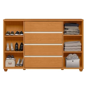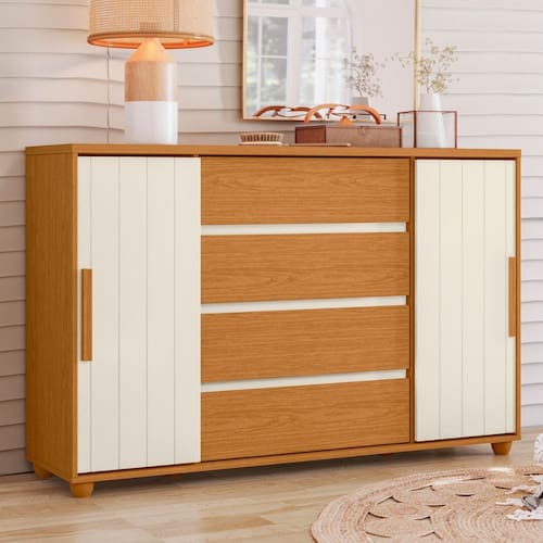 A Cômoda Evidenza é uma excelente opção para organização. Possui gavetas espaçosas com corrediças telescópicas que garantem melhor abertura e portas deslizantes com detalhe usinado frisado. Além disso, contém prateleiras nas quais você pode acomodar objetos pessoais.