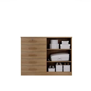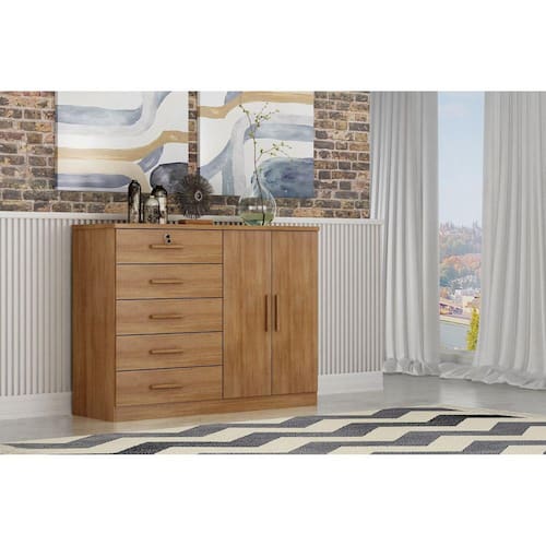 Comoda com 5 gavetas com corrediças telescópicas com abertura total e trava de segurança, gaveta com chave, puxadores externo revestido na cor bronze, portas com dobradiça de 25mm, prateleiras bem distribuidas, tampo de 25mm em MDF. Produto Montado: Sim Acabamento da Gaveta: Pintura Texturizada UV Acabamento da Porta: Pintura Texturizada UV Acabamento da Prateleira: Pintura Texturizada UV Ambiente Principal: Quarto codigo_ean: 7908308772014 Complexidade da Montagem: Média: pode ser montado por mais de uma pessoa e/ou necessite de maior conhecimento para montagem Cor: Cumaru Cor do Produto: Cumaru Cor Interna: Cumaru Escala de Brilho: Fosco Escala de Brilho da Gaveta: Fosco Escala de Brilho da Porta: Fosco Escala de Brilho da Prateleira: Brilhante Gaveta com Chave: Sim Itens Inclusos: 1 Cômoda, Kit Ferragens e Manual de Montagem Linha ou Coleção: Space Manual de Montagem e Instalação: https://product-hub-prd.madeiramadeira.com.br/838695/documents/d4c76d66-2cdb-47b3-82bc-4f17fe7908441054685manualcomodaspace.pdf Material da Gaveta: MDP Material da Porta: MDP Material da Prateleira: MDP Material do Fundo: MDP Material do Puxador da Gaveta: MDF Material do Puxador da Porta: MDF Material Principal: MDP Necessita Montagem: Sim Origem do Produto: Nacional Peso: 64 kg Peso Máximo por Gaveta: 5 kg Peso Máximo por Prateleira: 10 kg Possui Espelho: Não Possui Nichos: Não Possui Pés: Não Possui Portas: Sim Possui Prateleiras: Sim Quantidade de Gavetas: 05 Gavetas Quantidade de Prateleiras: 03 Prateleiras Recomendações de Uso, Manutenção e Limpeza: Pano úmido, sem uso adicional de produto abrasivos Sapatas Niveladoras: Não Sistema de Montagem: Parafusos, cavilhas entre outros. Suporta Até (kg): 55 kg Tipo de Corrediça da Gaveta: Metálica Telescópica Tipo de Dobradiça/Corrediça da Porta: Metálica Tipo de Porta: Bater Tipo de Puxador da Gaveta: Externo Tipo de Puxador da Porta: Externo