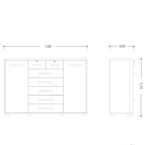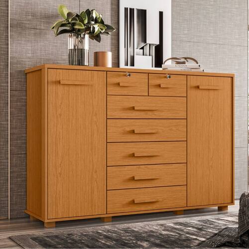 A Cômoda Fontana é moderna e robusta. Possui 7 gavetas, sendo as 2 menores com chaves. Contém também 2 portas, uma com cabideiro e outra com prateleiras. Um produto bem distribuído e completo que irá compor seu quarto com mais beleza e sofisticação.