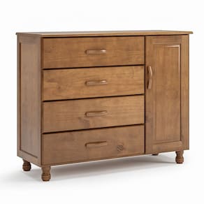 A Cômoda 4 Gavetas 1 Porta 100% Madeira Rústica Ariel é a escolha perfeita para quem busca um móvel robusto, funcional e com presença marcante no ambiente. Produzida com madeira de Pinus de reflorestamento, ela combina resistência e consciência ambiental. Seu acabamento em pintura UV valoriza os veios naturais da madeira, enquanto os pés maciços torneados trazem um toque de charme e sofisticação ao estilo rústico. As quatro gavetas com corrediças metálicas oferecem ótimo espaço para organização, e a porta lateral com dobradiça de pressão garante ainda mais praticidade no uso. Os puxadores em madeira complementam o visual artesanal e acolhedor, tornando essa cômoda uma excelente opção para quem deseja aliar durabilidade e elegância no quarto.