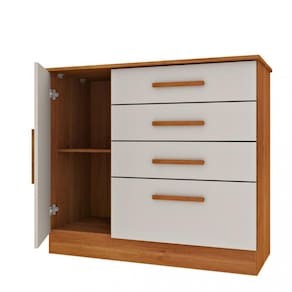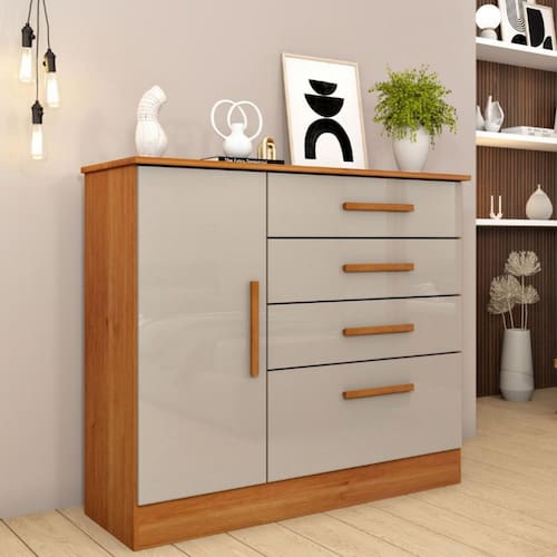 Com a Cômoda Chicago, seu quarto ficará completo e seus pertences bem organizados. Produzida inteiramente em MDP, esta cômoda possui 4 gavetas com corrediças telescópicas, uma porta com espaço para sapateira e um tampo de 25mm. Seu acabamento é resistente, com impressão UV e verniz de alta durabilidade.