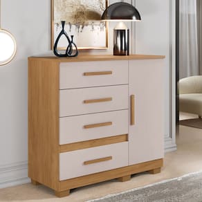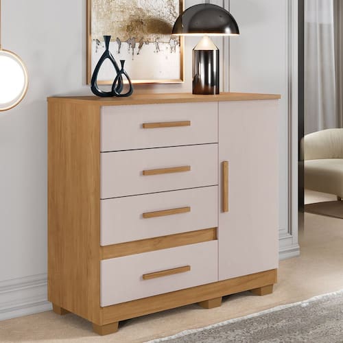 A Cômoda Florença com seu lindo design trás charme e elegância a qualquer espaço, contém 1 porta e 1 prateleira para acomodar seus acessórios, além de possuir 4 gavetas com corrediça telescópica que proporciona uma maior suavidade em seu uso, ideal para pequenos espaços.