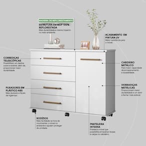 A Cômoda Flower, a combinação perfeita de estilo e funcionalidade! Com quatro amplas gavetas, ela organiza roupas, toalhas e lençóis com facilidade. Seu compartimento com cabideiro e prateleira removível oferece versatilidade, enquanto os rodízios facilitam a movimentação para uma limpeza sem esforço. Transforme seu ambiente com a Cômoda Flower!