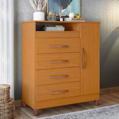 A Cômoda Turquesa é uma ótima cômoda para deixar o ambiente ainda mais atrativo. Facilita na organização dos pertences contando com sua porta e quatro gavetas confeccionados com materiais de ótima qualidade e durabilidade.