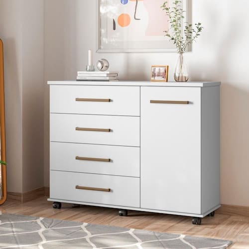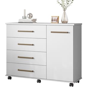 Produto imponente de dimensões amplas! A cômoda Flora possui gavetas com maior profundidade e deslize perfeito devido as corrediças telescópicas, com rodízios facilitam a movimentação do móvel para limpeza e compartimento com porta, prateleira e cabideiro.