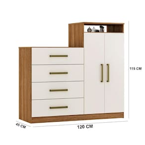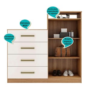 Uma cômoda elegante que complementa o ambiente e oferece muita praticidade. Com quatro gavetas espaçosa e um armário de duas portas com duas prateleiras interna, espaço para acomodação de roupas e objetos não será um problema. Ainda conta com um nicho na parte superior para itens menores ou objetos de decoração. Com puxadores na cor bronze, sua fabricação é feita em MDP de alto padrão, com acabamento resistente, proporcionado por sua pintura UV. Para garantir a qualidade do produto dentro da embalagem, as caixas são revestidas por um plástico termoencolhível e todas as peças são separadas por isomanta, tudo para preservar e evitar o atrito entre as peças dentro da embalagem. Você contará também com um manual com o passo a passo para auxiliar no momento da sua montagem