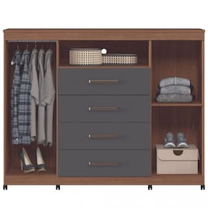 Além de oferecer um espaço generoso, esta cômoda impressiona com seu design prático e funcional. Com duas portas distintas: uma porta equipada com cabideiro em alumínio, ideal para pendurar calças, camisas, camisetas e muito mais; enquanto a outra porta conta com prateleiras para guardar sapatos, caixas, decorações e outros objetos essenciais do seu dia a dia. Suas quatro amplas gavetas deslizam suavemente sobre corrediças metálicas, garantindo um armazenamento organizado e de fácil acesso para suas roupas.