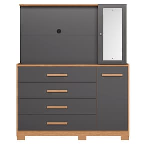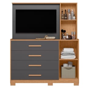 A Cômoda Ilhabela é ideal para quem precisa de um produto completo para seu lar. Possui um painel que suporta TV de até 43 polegadas, 4 gavetas espaçosas com corrediças telescópicas, sapateira inferior e armário lateral com espelho e chave para guardar pertences