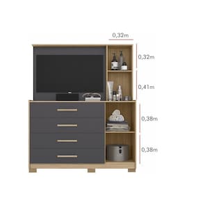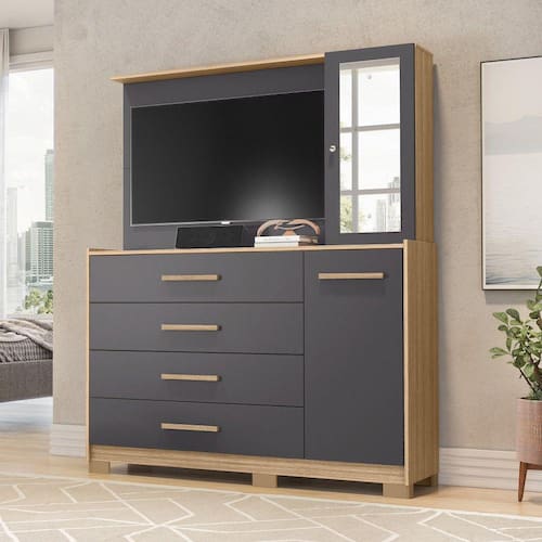 A Cômoda Ilhabela é ideal para quem precisa de um produto completo para seu lar. Possui um painel que suporta TV de até 43 polegadas, 4 gavetas espaçosas com corrediças telescópicas, sapateira inferior e armário lateral com espelho e chave para guardar pertences