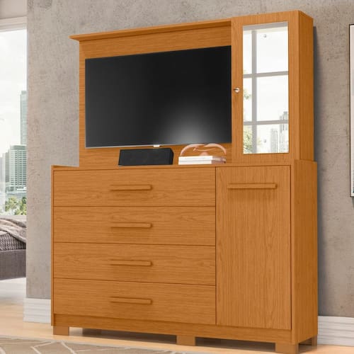 A Cômoda Ilhabela é ideal para quem precisa de um produto completo para seu lar. Possui um painel que suporta TV de até 43 polegadas, 4 gavetas espaçosas com corrediças telescópicas, sapateira inferior e armário lateral com espelho e chave para guardar pertences