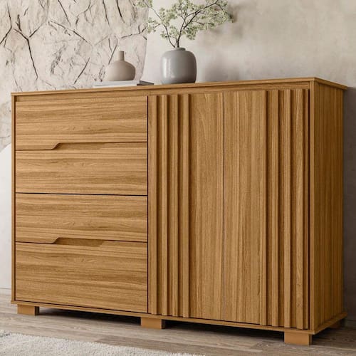 Características: Estrutura em MDP 4 Gavetas 2 Portas 2 Portas Corrediças telescópicas, Dobradiças 35mm com amortecedor, Portas com detalhes ripados, Pés em pvc Puxadores usinados. Gaveta suporta peso de até 8kg cada Prateleira suporta peso de até 6kg cada