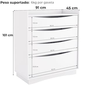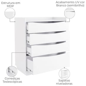 Mesa Cômoda M260, solução funcional com design inteligente. Estrutura em MDP (15mm) com acabamento em pintura UV. Acompanha sapatas niveladoras e 4 gavetas usinadas (sendo 1 gavetão) equipadas com corrediças telescópicas, para maior facilidade no dia a dia. Este produto será entregue em 01 volume.