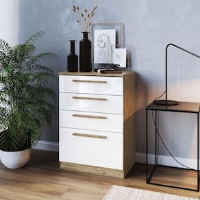 Cômoda com 4 gavetas CM31. Corrediças metálicas e puxadores decorativos, tradicional e atemporal. O acabamento em pintura UV garante a qualidade da peça e a durabilidade do produto.