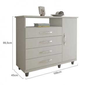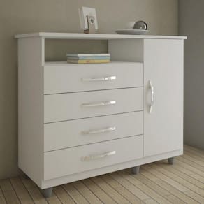 Quanta classe! A cômoda com sapateira paris é o móvel que faltava para você mobiliar o seu lar! A peça possui 4 gavetas e 1 porta com espaço suficiente para colocar as suas roupas e acessórios. A Cr neutra proporcionam uma decoração elegante. Prática, bonita e indispensável. Acabamento: Pintura UV Acabamento da Gaveta: Pintura Acabamento da Porta: Pintura Acabamento da Prateleira: Pintura Acabamento dos Pés: Pintura : 99,5 cm : 99,5 cm dos Pés: 6 cm Ambiente: Quarto Complexidade da Montagem: Média: pode ser montado por mais de uma pessoa e/ou necessite de maior conhecimento para montagem Cr: Branco Cr: Branco Cr Interna: Branco Cr Predominante: Branco Escala de Brilho: Brilhante Escala de Brilho da Gaveta: Fosco Escala de Brilho da Porta: Fosco Escala de Brilho da Prateleira: Brilhante Estilo: Moderno Gaveta com Chave: Não Itens Inclusos: 1 Cômoda e Manual de Montagem. : 108 cm : 108 cm Linha ou Coleção: Paris Material da Gaveta: MDP Material da Porta: MDP Material da Prateleira: MDP Material do Fundo: HDF Material do Puxador da Gaveta: Plástico Material do Puxador da Porta: Plástico Material dos Pés: Plástico Material Principal: MDP Necessita Montagem: Sim Peso: 38 kg Peso Máximo por Gaveta: 9 kg Peso Máximo por Prateleira: 9 kg Possui Espelho: Não Possui Gavetas: 04 Possui Gavetas: 04 Possui Pés: 06 Possui Portas: 01 Possui Prateleiras: 02 Possui Rodízio: Não : 45 cm : 45 cm Recomendações de Uso, Manutenção e Limpeza: Limpar com flanela limpa e seca. Não usar produtos abrasivos. Sapatas Niveladoras: Não Sistema de Montagem: Parafuso, Minifix Suporta até (kg): 50 kg Tamanho: Tipo de Corrediça da Gaveta: Metálica Simples Tipo de Dobradiça/Corrediça da Porta: Metálica Tipo de Porta: Bater Tipo de Puxador da Gaveta: Externo Tipo de Puxador da Porta: Externo