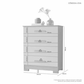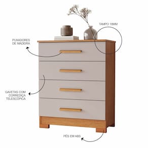 A Cômoda 4 Gavetas Compacta Lídia é a solução perfeita para você! Ela combina qualidade, funcionalidade e elegância para transformar seu quarto em um ambiente moderno e organizado. Gavetas que deslizam com corrediças telescópicas garantem uma abertura suave e maior capacidade de carga. Guarde suas roupas, acessórios e objetos pessoais de forma prática e sempre acessível. O tampo de 1,8 cm oferece estabilidade extra, ideal para apoiar itens de decoração ou o que você precisar. Seu design clean harmoniza com diversos estilos de decoração. Produto Montado: Sim Acabamento da Gaveta: Pintura UV Ambiente Principal: Quarto codigo_ean: 7900288197719 Complexidade da Montagem: Baixa: pode ser montado por uma pessoa sozinha Cor: Cinamomo / Off White Cor do Produto: Cinamomo / Off White Escala de Brilho: Fosco Escala de Brilho da Gaveta: Fosco Gaveta com Chave: Não Itens Inclusos: 1 Cômoda, Kit Ferragens e Manual de Montagem Linha ou Coleção: Lídia Manual de Montagem e Instalação: https://product-hub-prd.madeiramadeira.com.br/281631512/documents/a74ce681-7a47-4764-9358-08d724d83fe4307873064517527790134111.pdf Marca: JCM Móveis Material da Gaveta: MDP Material do Fundo: HDF Material do Puxador da Gaveta: MDF Material dos Pés: PVC Material Principal: MDP Necessita Montagem: Sim Origem do Produto: Nacional Pés Reguláveis: Não Peso: 28 kg Peso Máximo por Gaveta: 8 kg Possui Espelho: Não Possui Nichos: Não Possui Pés: 04 Possui Portas: Não Possui Prateleiras: Não Possui Rodízio: Não Quantidade de Gavetas: 04 Gavetas Recomendações de Uso, Manutenção e Limpeza: Pano Levemente Úmido Sapatas Niveladoras: Não Sistema de Montagem: Parafusos e Minifix Suporta Até (kg): 40 kg Tipo de Cômoda: Adulto Tipo de Corrediça da Gaveta: Metálica Telescópica Tipo de Puxador da Gaveta: Externo