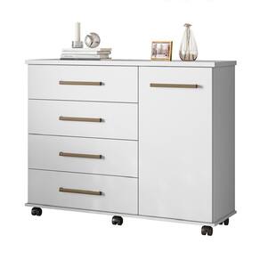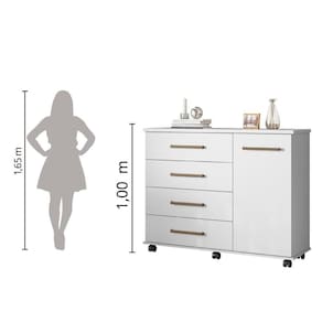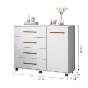 DESCRIÇÃO: Produto imponente de dimensões amplas, gavetas com maior profundidade e deslize perfeito devido as corrediças telescópicas, rodizios facilitam a movimentação do móvel para limpeza e compartimento com porta com prateleira e cabideiro. Para garantir a quali | NOME: Cômoda Flora | MARCA: Demobile | COR: Branco | MEDIDAS: A: 101cm; L: 125cm; P: 45cm | PUXADOR: Em bronze Metálicos | CORREDIÇAS: Telescópicas | PÉS: Com rodízios | PORTAS: 1 porta | GAVETAS: 4 gavetas | PESO: 48,8kg | EMBALAGEM: As caixas são revestidas por um plástico termoencolhível e todas as peças são separadas por isomanta, tudo para evitar o atrito entre as peças dentro da embalagem | OBSERVAÇÃO: Limpar com flanela ou pano macio seco, não utilizar produtos abrasivos, desengordurantes, álcool ou solvente. Não expor o produto diretamente à luz solar e à umidade. | ITENS INCLUSOS: 1 Manual de Montagem e 1 Cômoda | AVISO: Montagem não inclusa. Entregamos até a porta de entrada da casa do cliente ou até a portaria do condomínio | QUANTIDADE DE CAIXAS DE EMBALAGEM:: 1 Cor: Branco