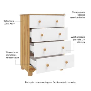 Cômoda 4 Gavetas Junior Peroba. A Cômoda Júnior simples tem o tampo com as bordas laqueadas, os puxadores são de plásticos, as corrediças são metálicas, pés plásticos já estão incluso, cômoda só com gavetas. Facilidade na montagem, volumes bem embalados e segurança na embalagem. Produtos 100 em MDF.