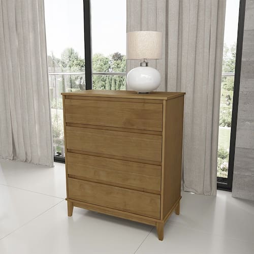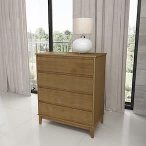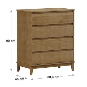 Características: Estrutura em MDF de 15mm Pintura Acetinada Verniz PU e UV Pés exclusivos em Madeira Maciça Frentes de Gaveta em Madeira Maciça 04 Gavetas com Corrediças Telescópicas e puxador cava Peso Máximo Suportado pela Gaveta 05kg Distribuídos Isolamento de Peças com Manta de Polietileno Expandido (Isomanta)