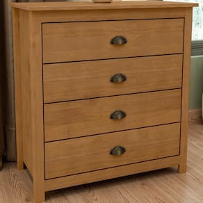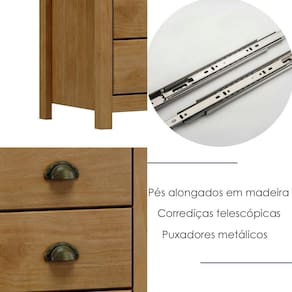 Cômoda projetada para quem busca um móvel sofisticado e atemporal. Com 80cm de largura e produzida em madeira maciça de pinus de reflorestamento, sua estrutura robusta garante durabilidade e resistência. Seu acabamento com pintura acetinada em verniz PU e UV realça a beleza natural da madeira enquanto protege contra desgastes do dia a dia. O design funcional inclui 04 gavetas com corrediças telescópicas, permitindo uma abertura suave e silenciosa, puxadores metálicos no estilo concha que agregam um charme artesanal, e pés alongados em madeira que trazem leveza e sofisticação ao móvel. Este móvel chegará em sua casa separado em 01 volume.