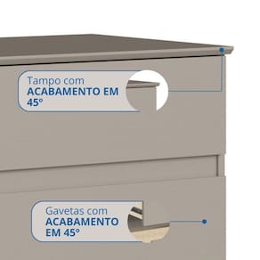Com um design que destaca acabamentos em 45º no tampo e nas gavetas, a Cômoda Maia adiciona um toque de estilo e personalidade ao seu ambiente. Ela possui quatro gavetas equipadas com corrediças telescópicas, garantindo uma abertura suave e estável. Os puxadores invisíveis das gavetas oferecem uma estética harmoniosa, complementando perfeitamente a decoração. O produto também inclui pés que acompanham o design.