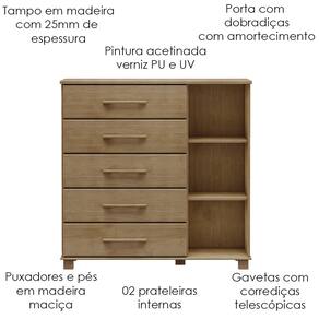 Apresentamos a Cômoda que combina funcionalidade e elegância para o seu ambiente. Produzida com madeira maciça de pinus de reflorestamento, garante qualidade e durabilidade. A pintura acetinada em verniz PU e UV oferece um acabamento suave e resistente, realçando a beleza natural da madeira enquanto protege contra desgastes do dia a dia. Com 125cm de largura, o design funcional conta com 05 gavetas equipadas com corrediças telescópicas, que proporcionam um deslizamento suave e sem esforço, 01 porta com dobradiças com amortecimento, que permitem um fechamente sem impactos, além de 02 prateleiras internas que oferecem mais espaço para armazenamento e organização. O tampo em madeira de 25mm de espessura confere robustez e sofisticação ao design, enquanto os puxadores e pés em madeira maciça garantem um toque natural e refinado, que harmoniza perfeitamente com qualquer decoração. Este móvel chegará em sua casa separado em 02 volumes.