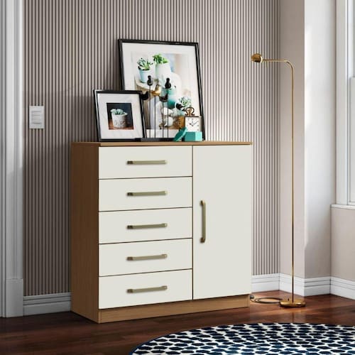 A Cômoda 5 Gavetas 1 Porta Milão Aramóveis, fabricada em MDP 15mm e 12mm de espessura. Seu espaçoso interior proporciona estabilidade ao móvel, enquanto os puxadores de plástico conferem resistência. Equipada com dobradiças metálicas, a cômoda oferece maior facilidade ao abrir e fechar as portas. O acabamento em verniz de alto brilho não apenas conserva o móvel, mas também proporciona uma estética contínua, garantindo beleza, resistência e prolongando a vida útil do produto.