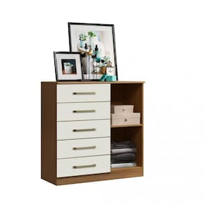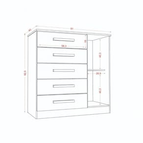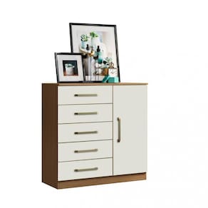 Características: Estrutura em MDP de 15mm e 12mm 1 Porta 5 Gavetas Prateleira Puxadores de Plástico Corrediça metálica Dobradiças metálicas Acabamento em verniz texturizado