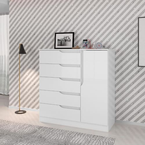 Características: Estrutura em MDP 5 Gavetas 1 Porta Corrediça metálica Acabamento UV 1 Prateleira interna