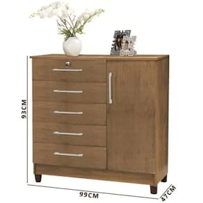 Cômoda 5 Gavetas 1 Porta Vitória Rud RackA Cômoda 5 Gavetas 1 Porta Vitória Rud Rack foi desenvolvida para pessoas de bom gosto e que precisam de móveis funcionais e de custo benefício. Esta cômoda possui cinco amplas gavetas fáceis de abrir, uma porta lateral com prateleira interna para que os pertences sejam bem acomodados. Aproveite!Medidas:Altura: 93 cmLargura: 99 cmProfundidade: 47 cm– Produto em MDP e MDF– 05 Gavetas com corrediças metalicas– Prateleira Interna– 04 pés em pvcInformações importantes:Os objetos que ambientam as fotos não acompanham o produto.Não nos responsabilizamos pela montagem/instalação dos produtos.Montagens, desmontagens e instalações são responsabilidades do cliente.Indicamos que contrate uma empresa de montagem ou um montador de sua confiança.Além disso, favor verificar se os pés e acessórios estão dentro do forro inferior do produto.Em suma, todas as informações divulgadas sobre o produto são de responsabilidade do Fabricante.Fique atento, nossas cores podem sofrer alterações dependendo do seu monitor ou tela do seu celular.