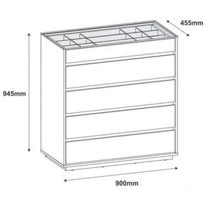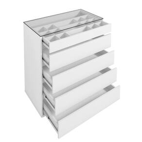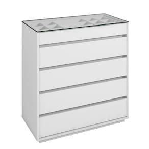 Caracteristicas: 5 Gavetas com corredicas telescopicas Acabamento Print Wood Atoxico e antimofo Bordas com acabamento Soft PU Estrutura em MDP Gaveta superior com organizador interno para joias e relogios Gaveta suporta peso maximo 3kg cada Tampo de vidro 8mm Travessas transversais em MDP
