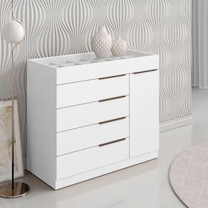 DIFERENCIAL: 5 gavetas e 1 porta para melhor organização, gaveta superior possui divisórias com espaço para guardar jóias e maquiagens, acabamento em verniz, garantindo a conservação do móvel e dando resistência e durabilidade a vida útil da cômoda.
