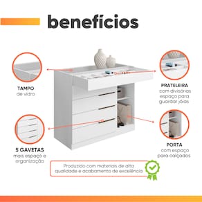 A Cômoda com porta joias organizador e tampo de vidro, é perfeita para quem busca praticidade e beleza! Composta por 5 gavetas espaçosas com suave deslize, sendo uma gaveta com divisórias desenvolvida especialmente para organizar seus pertences de maquiagem e beleza, 1 porta com amplo espaço que pode ser utilizada para guardar seus objetos pessoais, roupas, e também sapatos! A Cômoda Sevilha é a escolha ideal que vai atender todas as suas necessidades.