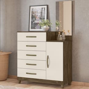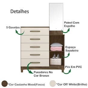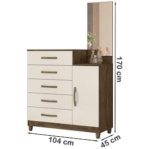 Comoda 5 Gavetas E 1 Porta Com Espelho, é perfeita para você que procura praticidade, organização e beleza para compor o seu quarto. Estrutura em MDP de 12 e 15 mm que proporcionam melhor acabamento nas bordas e superfícies, e pintura com acabamento em UV(Castanho-Fosco/Off White-Brilho). Composta por 1 porta articulada, 5 gavetas, puxadores na cor bronze, painel com espelho, espaço para sapateira e acompanham pés em PVC. Deixando o ambiente ainda mais elegante e aconchegante. Este móvel chegará na sua casa separado em 03 volumes.