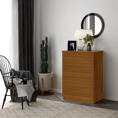 Cômoda 100% MDF, contendo 5 amplas gavetas com corrediças telescópicas e reforço no fundo. A 1ª gaveta é um pouco mais rasa, contendo divisórias para melhor organizar os objetos ou pequenas peças de roupa. Produto Montado: Sim Acabamento da Gaveta: Pintura UV Ambiente Principal: Quarto codigo_ean: 7900288073648 Complexidade da Montagem: Média: pode ser montado por mais de uma pessoa e/ou necessite de maior conhecimento para montagem Cor: Marrom Cor do Produto: Marrom Cor Flex: não Cor Interna: Nogueira Escala de Brilho: Fosco Gaveta com Chave: Não Itens Inclusos: 1 Cômoda, 1 Kit Ferragens e 1 Manual de Montagem Manual de Montagem e Instalação: https://product-hub-prd.madeiramadeira.com.br/969188/documents/68884068-8863-420e-bc84-c91d1ad16bdb2540823412717309095965078.pdf Marca: Móveis Fazzio Material da Gaveta: MDF Material do Fundo: mdf Material Principal: MDF Montagem Flex: não Necessita Montagem: Sim Origem do Produto: Nacional Peso: 51 kg Peso Máximo por Gaveta: 5 kg Possui Espelho: Não Possui Nichos: Não Possui Pés: Não Possui Portas: Não Possui Prateleiras: Não Quantidade de Gavetas: 05 Gavetas Recomendações de Uso, Manutenção e Limpeza: Usar pano levemente umedecido com agua Sapatas Niveladoras: Não Sistema de Montagem: Parafusos atarraxantes, sistema minifix e cavilhas. Suporta Até (kg): 25 kg Tipo de Corrediça da Gaveta: Metálica Telescópica Tipo de Puxador da Gaveta: Não Possui Marca: Móveis Fazzio