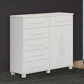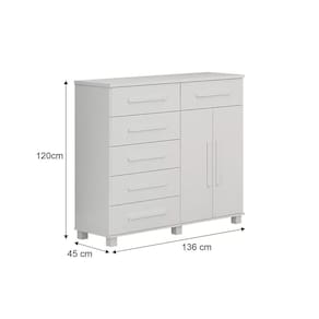 Cômoda 02 portas com 06 gavetas cor branco Cômoda linda e espaçosa para deixar seu quarto ainda mais lindo e completo. Corrediças telescópias e puxador de madeira. Dimensões do produto: Altura: 1200 mm Largura: 1360 mm Profundidade: 1200 mm. 02 portas 06 gavetas 01 prateleira Produto Montado: Sim Acabamento da Gaveta: Pintura UV Acabamento da Porta: Pintura Ambiente Principal: Quarto codigo_ean: 7909903315200 Complexidade da Montagem: Média: pode ser montado por mais de uma pessoa e/ou necessite de maior conhecimento para montagem Cor: Branco Cor do Produto: Branco Cor Interna: Branco Escala de Brilho: Brilhante Escala de Brilho da Porta: Fosco Gaveta com Chave: Não Itens Inclusos: 1 Cômoda, Manual de Montagem e Kit Ferragens Manual de Montagem e Instalação: https://product-hub-prd.madeiramadeira.com.br/712255/documents/fad694b4-6fad-4ab1-b074-0c9d08088dc21324997comodasaopaulo.pdf Material da Gaveta: MDF Material da Porta: MDF/MDP Material do Fundo: HDF Material do Puxador da Gaveta: MDF Material do Puxador da Porta: Plástico Material dos Pés: Plástico Material Principal: MDF/MDP Necessita Montagem: Sim Origem do Produto: Nacional Peso: 71 kg Peso Máximo por Gaveta: 10 kg Possui Espelho: Não Possui Nichos: Não Possui Pés: 05 Possui Prateleiras: Não Possui Rodízio: Não Recomendações de Uso, Manutenção e Limpeza: Limpar com pano seco Sapatas Niveladoras: Não Sistema de Montagem: https://product-hub-prd.madeiramadeira.com.br/712255/documents/62456d88-e7d7-4ee6-87b1-3524b0907f69782635firenzeyescasa1.pdf Suporta Até (kg): 10 kg Tipo de Corrediça da Gaveta: Metálica Telescópica Tipo de Dobradiça/Corrediça da Porta: Aço Tipo de Porta: Bater Tipo de Puxador da Gaveta: Externo Tipo de Puxador da Porta: Externo