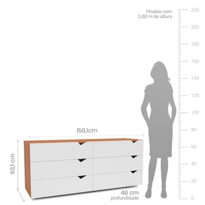 A cômoda 6 gavetas Porto, da Politorno Móveis, combina design moderno, elegante e sofisticado, agregando requinte ao ambiente. Produzida em MDP/MDF, conta com acabamento em pintura UV e FF, proporcionando maior resistência e durabilidade. Seus puxadores embutidos garantem um visual clean e sofisticado, enquanto as corrediças telescópicas oferecem um deslizamento suave das gavetas. Com 63,1 cm de altura, 150,1 cm de largura e 46 cm de profundidade, é ideal para organizar roupas e acessórios, sendo uma excelente opção para quartos e closets. De alta qualidade, essa cômoda une funcionalidade e estilo para um ambiente bem estruturado. Produto Montado: Sim Acabamento da Gaveta: Pintura UV Altura dos Pés: cm Ambiente Principal: Quarto codigo_ean: 7900288109798 Complexidade da Montagem: Média: pode ser montado por mais de uma pessoa e/ou necessite de maior conhecimento para montagem Cor: Freijó/Branco Cor do Produto: Freijó/Branco Cor Interna: Freijó Escala de Brilho: Semi-Fosco Escala de Brilho da Gaveta: Semi-Fosco Gaveta com Chave: Não Itens Inclusos: 1 Cômoda, Kit de Ferragens, Manual de Montagem e Termo de Garantia Linha ou Coleção: Porto Manual de Montagem e Instalação: https://product-hub-prd.madeiramadeira.com.br/983935/documents/3383a8f9-5e98-4726-96e0-016611230cfd2781260622417436241777427.pdf Marca: Politorno Material da Gaveta: MDF/MDP Material do Fundo: MDF/MDP Material Principal: MDF/MDP Necessita Montagem: Sim Origem do Produto: Nacional Peso: 27,11 kg Peso Máximo por Gaveta: 5 kg Possui Espelho: Não Possui Nichos: Não Possui Pés: Não Possui Portas: Não Possui Prateleiras: Não Quantidade de Gavetas: 06 Gavetas Recomendações de Uso, Manutenção e Limpeza: Utilize um pano macio umedecido com água e sabão neutro, seguido de pano seco. Não utilize produtos químicos ou abrasivos para limpeza, pois estes danificam o revestimento do móvel. Sapatas Niveladoras: Sim Sistema de Montagem: Cavilha, Parafuso, Minifix e prego Suporta Até (kg): 30 kg Tipo de Cômoda: Adulto Tipo de Corrediça da Gaveta: Metálica Telescópica Tipo de Puxador da Gaveta: Embutido undefined: 983938
