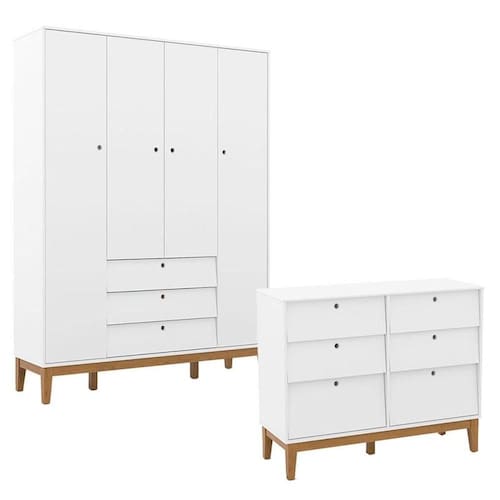 Cômoda 6 Gavetas e Guarda Roupa Unique 4 Portas Branco Soft Eco Wood - Matic