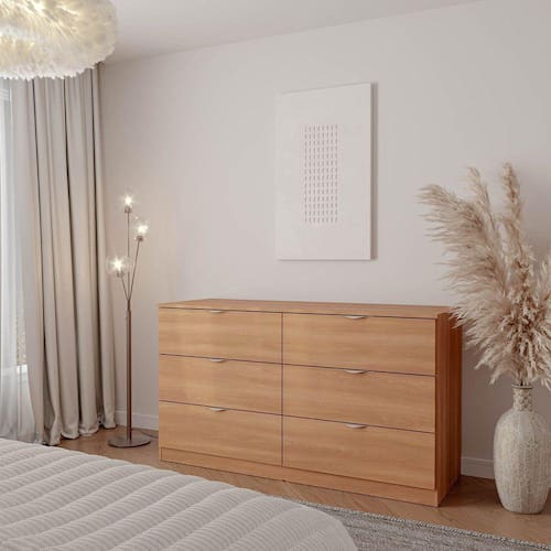 A cômoda Hera é uma peça de mobiliário elegante e funcional que combina design moderno e qualidade. Com 6 gavetas espaçosas, ela oferece muito espaço para guardar suas roupas, acessórios e objetos pessoais. As gavetas possuem trilhos telescópicos que garantem um deslizamento suave e silencioso, além de puxadores metálicos que dão um toque de sofisticação. A cômoda Hera é feita de MDP e MDF, com acabamento em Finish Foil que protege contra riscos e manchas. Ela faz parte da coleção Hera, que conta com outros móveis de quarto que combinam entre si, como guarda-roupa, escrivaninha e mesas de cabeceira. A cômoda Hera é a escolha ideal para quem busca praticidade, beleza e durabilidade em um só produto. Produto Montado: Sim Acabamento da Gaveta: Finish Foil Acabamento dos Pés: Finish Foil Altura dos Pés: 8 cm Ambiente Principal: Quarto codigo_ean: 7909903363423 Complexidade da Montagem: Média: pode ser montado por mais de uma pessoa e/ou necessite de maior conhecimento para montagem Cor: Louro Cor do Produto: Louro Cor Interna: Louro Escala de Brilho: Semi-Fosco Escala de Brilho da Gaveta: Semi-Fosco Gaveta com Chave: Não Informações Complementares: Puxador Metálico Acetinado, Frentes em chapa de 18mm com corrediças telescópicas, fundos em 6mm e sistema anti-tombamento. Itens Inclusos: Cômoda + Manual Linha ou Coleção: Hera Manual de Montagem e Instalação: https://product-hub-prd.madeiramadeira.com.br/861012/documents/555df98f-cdc8-44d8-86f5-d3855724d749manualdemontagemcomodahera.pdf Material da Gaveta: MDP Material do Fundo: MDF Material do Puxador da Gaveta: Metal Material dos Pés: MDP Material Principal: MDP Necessita Montagem: Sim Origem do Produto: Nacional Pés Reguláveis: Não Peso: 90,2 kg Peso Máximo por Gaveta: 8 kg Possui Espelho: Não Possui Nichos: Não Possui Pés: Rodapé Possui Portas: Não Possui Prateleiras: Não Possui Rodízio: Não Quantidade de Gavetas: 06 Gavetas Recomendações de Uso, Manutenção e Limpeza: Limpar com um pano limpo e seco Sapatas Niveladoras: Não Sistema de Montagem: Parafusos, Cavilhas e Minifix Suporta Até (kg): 50 kg Tipo de Corrediça da Gaveta: Metálica Telescópica Tipo de Puxador da Gaveta: Externo Ean: 7909903363423