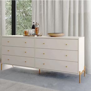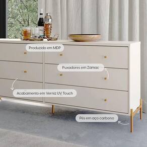 Especificações: Produzido em MDP com acabamento em Verniz UV Touch. Seis gavetas com corrediças telescópicas que promovem o deslizamento suave e silencioso. Puxadores em Zamac com pintura PU. Pés tubo de Aço Carbono com acabamento em pintura eletrostática. Altura dos pés: 14,5 cm. Peso Suportado no tampo: 10 kg. Peso Suportado por gaveta: 5 kg.