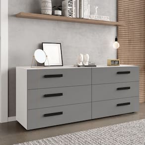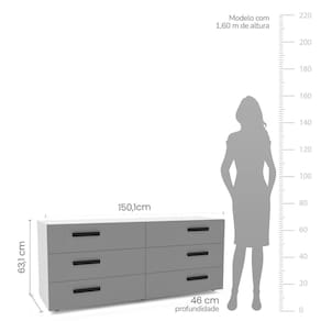 A cômoda 6 gavetas Lisboa, da Politorno Móveis, é uma opção sofisticada e funcional para o seu espaço. Com 63,1 cm de altura, 150 cm de largura e 46 cm de profundidade, oferece um excelente espaço de armazenamento, ideal para manter o ambiente organizado. Fabricada em MDP/MDF, com acabamento em pintura UV, a cômoda é resistente e durável. Seu design atemporal e elegante combina com diferentes estilos de decoração, agregando um toque refinado ao ambiente. As gavetas possuem corrediças telescópicas, garantindo deslizamento suave, e os puxadores externos facilitam o manuseio. Perfeita para quem busca qualidade e praticidade em um único móvel. Produto Montado: Sim Acabamento da Gaveta: Pintura UV Acabamento dos Pés: Polipropileno Altura dos Pés: 0,37 cm Altura Máxima dos Pés: 0.3700 Ambiente Principal: Quarto codigo_ean: 7900288111456 Complexidade da Montagem: Média: pode ser montado por mais de uma pessoa e/ou necessite de maior conhecimento para montagem Cor: Branco/Cinza Cor do Produto: Branco/Cinza Cor do Puxador: Preto Cor Interna: Branco Escala de Brilho: Semi-Fosco Escala de Brilho da Gaveta: Semi-Fosco Gaveta com Chave: Não Itens Inclusos: 1 Cômoda, Kit de Ferragens e Manual de Montagem. Linha ou Coleção: Lisboa Manual de Especificação Técnica: https://product-hub-prd.madeiramadeira.com.br/984312/documents/608e8810-2d80-4847-aee3-e477c446d76f2786027622417437731192172.pdf Manual de Montagem e Instalação: https://product-hub-prd.madeiramadeira.com.br/984312/documents/442cc04f-8855-4229-a83d-f4a42f7d17f52786021622417437731178648.pdf Marca: Politorno Material da Gaveta: MDF/MDP Material do Fundo: MDF/MDP Material do Puxador da Gaveta: MDF Material dos Pés: Plástico Material Principal: MDF/MDP Necessita Montagem: Sim Origem do Produto: Nacional Pés Reguláveis: Não Peso: 27,18 kg Peso Máximo por Gaveta: 5 kg Possui Espelho: Não Possui Nichos: Não Possui Pés: 06 Possui Portas: Não Possui Prateleiras: Não Possui Rodízio: Não Quantidade de Gavetas: 06 Gavetas Recomendações de Uso, Manutenção e Limpeza: Utilize um pano macio umedecido com água e sabão neutro, seguido de pano seco. Não utilize produtos químicos ou abrasivos para limpeza, pois estes danificam o revestimento do móvel. Sapatas Niveladoras: Sim Sistema de Montagem: Cavilha, Parafuso, Minifix e prego Suporta Até (kg): 30 kg Tipo de Cômoda: Adulto Tipo de Corrediça da Gaveta: Metálica Telescópica Tipo de Puxador da Gaveta: Externo undefined: 984316