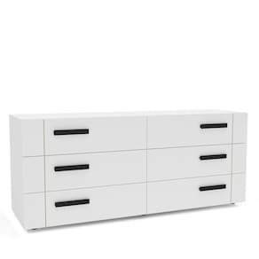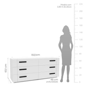 A cômoda 6 gavetas Lisboa, da Politorno Móveis, é uma opção sofisticada e funcional para o seu espaço. Com 63,1 cm de altura, 150 cm de largura e 46 cm de profundidade, oferece um excelente espaço de armazenamento, ideal para manter o ambiente organizado. Fabricada em MDP/MDF, com acabamento em pintura UV, a cômoda é resistente e durável. Seu design atemporal e elegante combina com diferentes estilos de decoração, agregando um toque refinado ao ambiente. As gavetas possuem corrediças telescópicas, garantindo deslizamento suave, e os puxadores externos facilitam o manuseio. Perfeita para quem busca qualidade e praticidade em um único móvel. Produto Montado: Sim Acabamento da Gaveta: Pintura UV Acabamento dos Pés: Polipropileno Altura dos Pés: 0,37 cm Altura Máxima dos Pés: 0.3700 Ambiente Principal: Quarto codigo_ean: 7900288111418 Complexidade da Montagem: Média: pode ser montado por mais de uma pessoa e/ou necessite de maior conhecimento para montagem Cor: Branco Cor do Produto: Branco Cor do Puxador: Preto Cor Interna: Branco Escala de Brilho: Semi-Fosco Escala de Brilho da Gaveta: Semi-Fosco Gaveta com Chave: Não Itens Inclusos: 1 Cômoda, Kit de Ferragens e Manual de Montagem. Linha ou Coleção: Lisboa Manual de Especificação Técnica: https://product-hub-prd.madeiramadeira.com.br/984308/documents/85e3bea5-96a3-4beb-b3a7-81530e0863382785774622417437721547041.pdf Manual de Montagem e Instalação: https://product-hub-prd.madeiramadeira.com.br/984308/documents/0bac6009-905f-4e39-a5a5-c2ac503a808c2785773622417437721526524.pdf Marca: Politorno Material da Gaveta: MDF/MDP Material do Fundo: MDF/MDP Material do Puxador da Gaveta: MDF Material dos Pés: Plástico Material Principal: MDF/MDP Necessita Montagem: Sim Origem do Produto: Nacional Pés Reguláveis: Não Peso: 27,18 kg Peso Máximo por Gaveta: 5 kg Possui Espelho: Não Possui Nichos: Não Possui Pés: 06 Possui Portas: Não Possui Prateleiras: Não Possui Rodízio: Não Quantidade de Gavetas: 06 Gavetas Recomendações de Uso, Manutenção e Limpeza: Utilize um pano macio umedecido com água e sabão neutro, seguido de pano seco. Não utilize produtos químicos ou abrasivos para limpeza, pois estes danificam o revestimento do móvel. Sapatas Niveladoras: Sim Sistema de Montagem: Cavilha, Parafuso, Minifix e prego Suporta Até (kg): 30 kg Tipo de Cômoda: Adulto Tipo de Corrediça da Gaveta: Metálica Telescópica Tipo de Puxador da Gaveta: Externo undefined: 984316