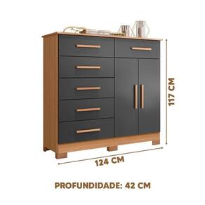 Dimensões da Cômoda: Largura 124 cm; Profundidade 42 cm; Altura 117 cm.