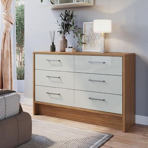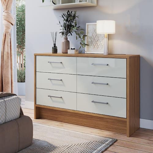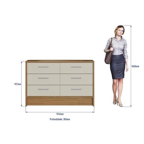 MDP frentes e caixas 15mmUma cômoda com toda a sofisticação para o seu quarto. Com 1,41 m de largura. São 6 gavetas com puxadores em alumínio, garantindo qualidade e durabilidade ao seu produto e corrediças telescópicas, com a abertura total das gavetas.