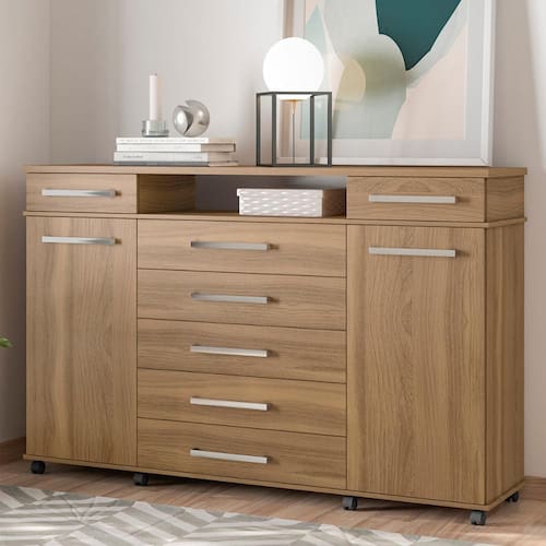 Cômoda robusta que oferece capacidade extrema de utilidade e organização devido ao grande número de gavetas e compartimento com portas sendo para sapatos e com bastão para cabides. Tampo reforçado de 25mm para TVs de maior dimensão e rodízios para a movimentação facilitada do móvel no ambiente. Para garantir a qualidade do produto dentro da embalagem, as caixas são revestidas por um plástico termoencolhível e todas as peças são separadas por isomanta, tudo para preservar e evitar o atrito entre as peças dentro da embalagem. Você contará também com um manual com o passo a passo para auxiliar no momento da sua montagem.