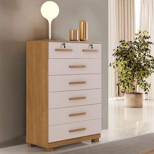 A Cômoda Barcelona com seu lindo design trás charme e elegância a qualquer espaço, produzido toda em chapa de 15 mm que garante uma boa durabilidade do produto, além de possuir 7 gavetas, sendo 2 gavetas com chave ainda contam com corrediça telescópica que proporciona uma maior suavidade em seu uso diário, acomoda muita roupa e seus acessórios tudo muito bem-organizado.