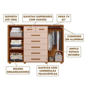 7 Gavetas com Corrediças Telescópicas: Garantem um deslizamento suave e silencioso, facilitando o acesso aos seus pertences e proporcionando uma organização eficiente.