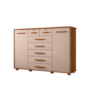Puxadores de MDF Revestidos: Adicionam um toque de elegância ao design da cômoda, sendo resistentes e esteticamente agradáveis.