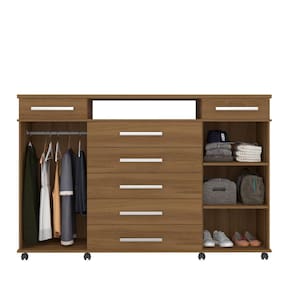 Produto fabricado em MDP e conta com puxadores na cor prata, cabideiro em alumínio e kit de rodízios.