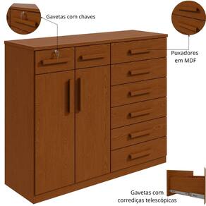 Caracteristicas: Estrutura Principal MDF/MDP Estrutura da porta e gaveta MDP 15mm Estrutura do Fundo HDF 2,5 mm 8 Gavetas com corredica Telescopica 2 Portas 2 Prateleiras Sistema de Montagem Parafusos e Minifix Suporta Ate -kg- 70 kg Peso Maximo por Gaveta 10 kg Peso Maximo por Prateleira 5 kg Acabamento em Pintura UV Escala de Brilho da Porta Brilhante